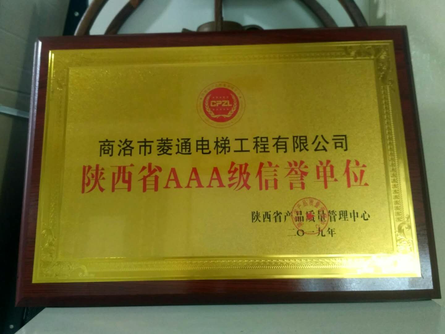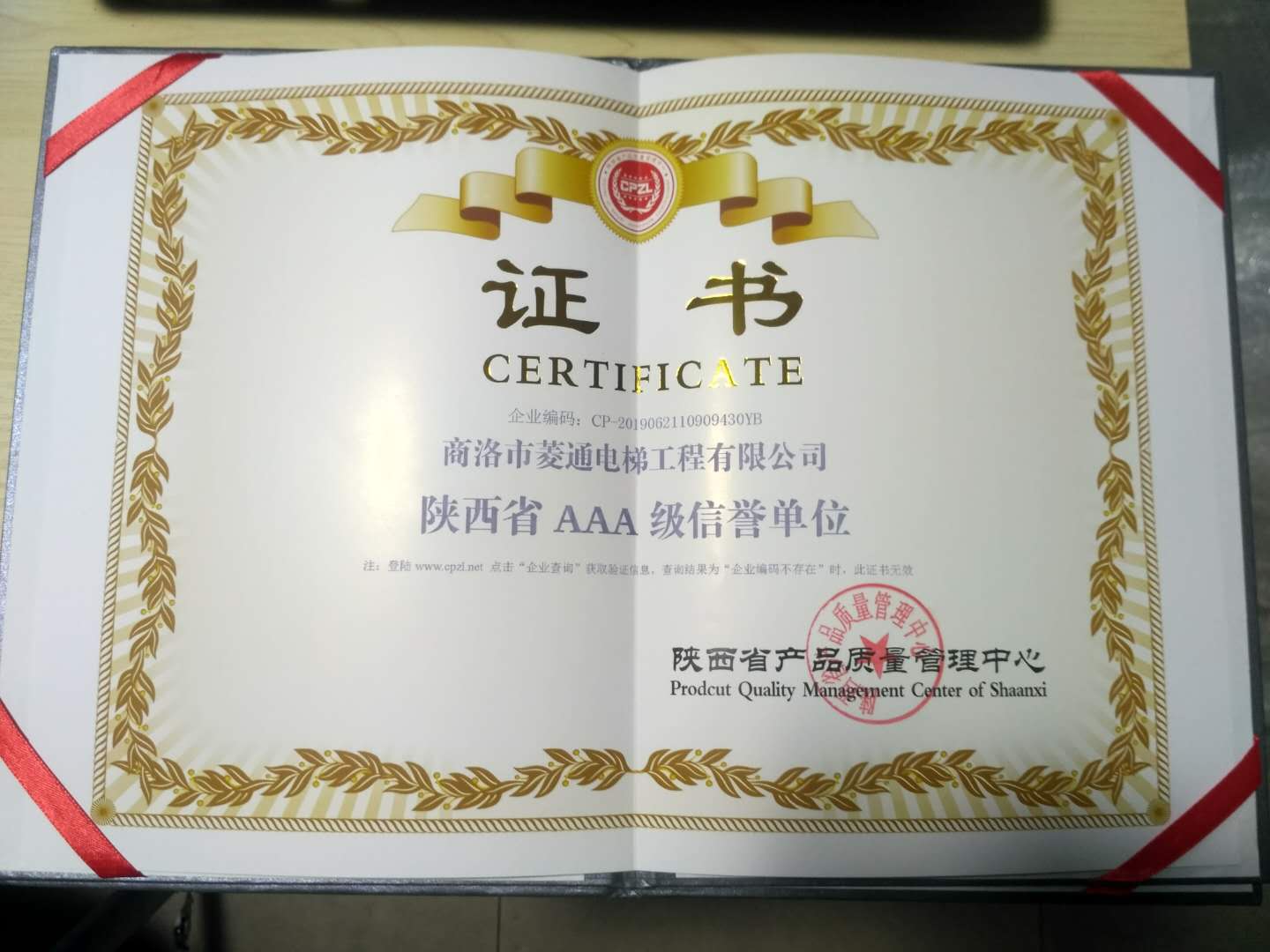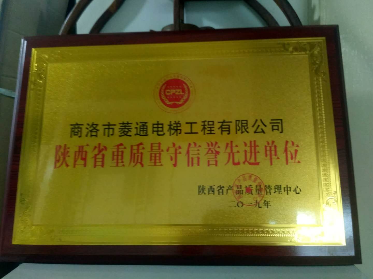 商洛菱通電梯工程有限公司,2019年很榮幸被陜西省產(chǎn)品質(zhì)量管理中心評為:陜西省AAA級信譽單位和陜西省重質(zhì)量守信譽先進單位;并頒發(fā)獎牌及榮譽證書。這個榮譽不但得益于各單位的支持與默契合作,更得益于我公司優(yōu)良的團隊氛圍和集體上下一致積極認真的工作態(tài)度。更得益于領(lǐng)導(dǎo)重承諾守信譽:提倡安全第一,質(zhì)量第一,信譽第一的原則。能被評為3A級信譽單位和信譽先進單位,既是對公司工作的肯定,也是對今后工作做得更好的一種鼓勵,我公司定會盡職盡責(zé)做得更好。